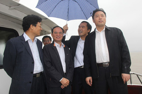 楊丕龍副廳長(zhǎng)等冒雨登上快艇甲板察看固岸應(yīng)急度汛工程