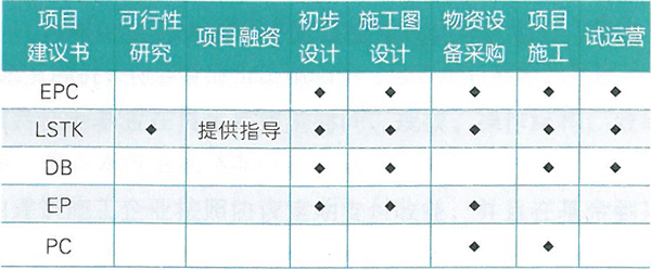 常見的工程總承包方式。工程總承包的主要方式有:設(shè)計采購施工總承包(EPC )、交鑰匙工程總承包 (LSTK )、設(shè)計建造工程總承包(DB )、設(shè)計采購總承包 (EP )、采購施工總承包(PC )。不同的承包方式,參與項目實施過程中的不同環(huán)節(jié)(見表1 )。