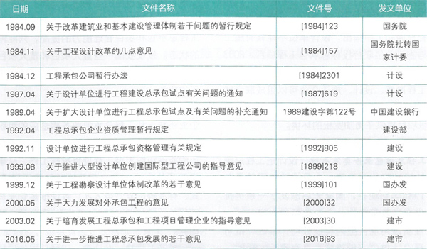 20世紀80年代,我國相關(guān)部門就下發(fā)文件,要求在設(shè)計、施工企業(yè)組建開展工程總承包的試點,從國家頒布的一系列文件中可以看出我國在推廣工程總承包業(yè)務(wù)方面的幾點變化(見表2 )。
