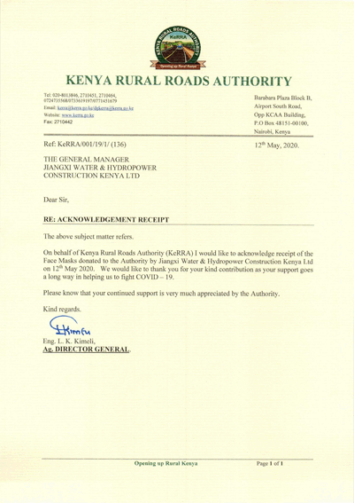 收到來(lái)自江西水建捐贈(zèng)的防疫物資后,肯尼亞鄉(xiāng)村公路局局長(zhǎng)由衷地表示感激,并向肯尼亞分公司寫(xiě)了一封感謝信,他在信中表示:“江西水建友好慷慨的捐贈(zèng),將為我們對(duì)抗新冠肺炎疫情提供長(zhǎng)遠(yuǎn)的支持,肯尼亞鄉(xiāng)村公路局對(duì)此深表感激?!?